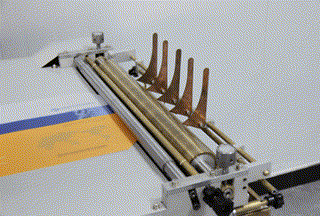 制作臺(tái)歷架演示 在SK840A書殼機(jī)上更換定位擋塊,就可快速批量完成標(biāo)準(zhǔn)臺(tái)歷架的制作。 |